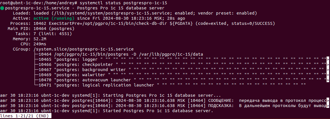 1systemctl status postgrespro-1c-15