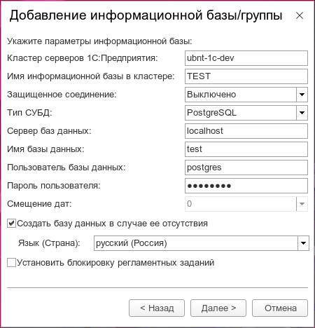 Оснастки MMC в Linux нет (и странно, если бы была), поэтому для создания информационной базы воспользуемся штатными средствами платформы. Добавим новую пустую базу для разработки. Для этого указываем имя кластера серверов, имя базы в кластере, тип сервера СУБД и его адрес, имя базы данных СУБД, имя и пароль суперпользователя СУБД, а также ставим флаг для создания БД в случае ее отсутствия.