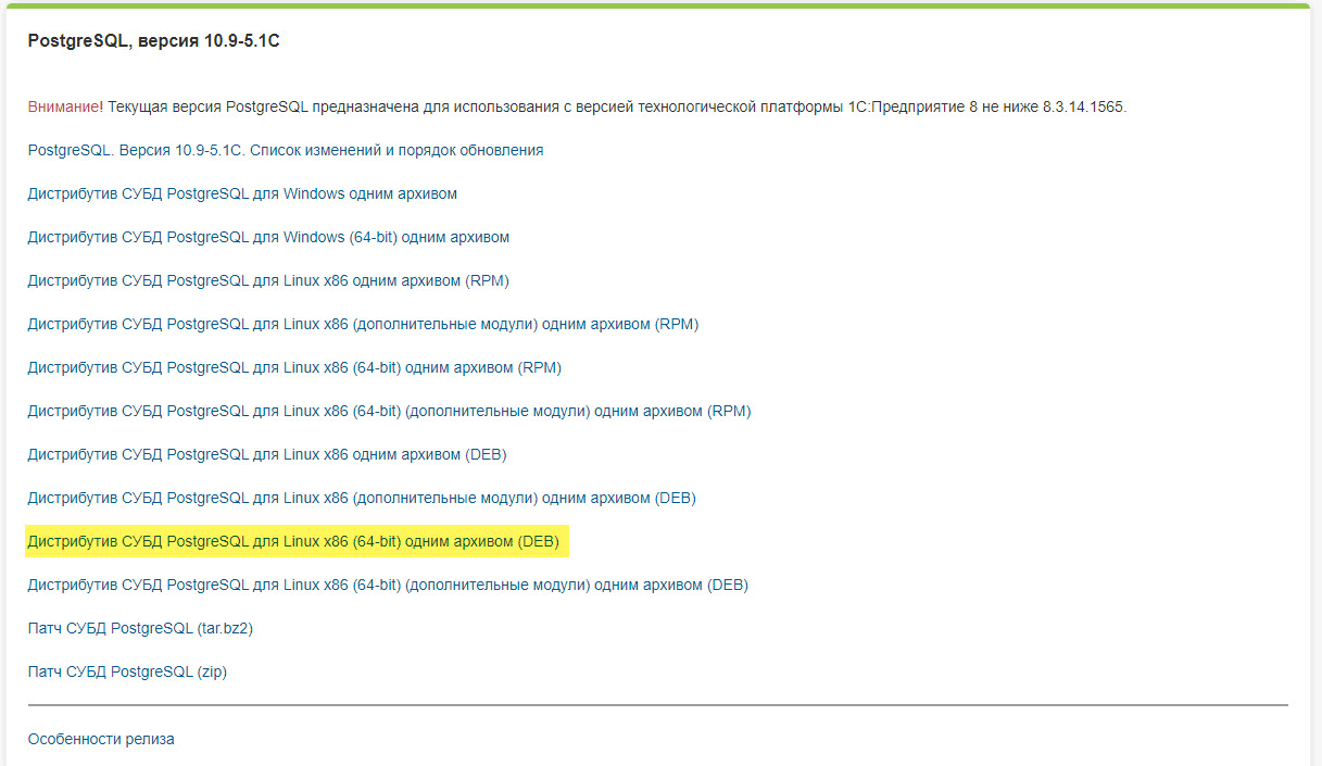 Из всего обилия ссылок на странице продукта нам потребуется только Дистрибутив СУБД PostgreSQL для Linux x86 (64-bit) одним архивом (DEB), сразу оговоримся, мы не видим никакого практического смысла использовать 32-битные версии сервера СУБД, поэтому будем производить установку 64-битной версии на 64-битную систему.