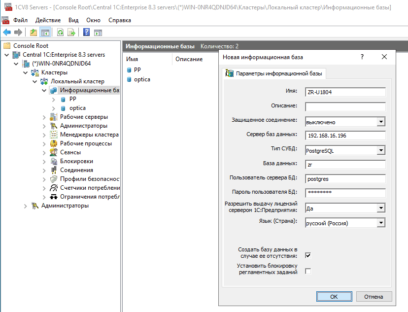 После чего можно создать новую базу через оснастку Администрирование серверов 1С Предприятия или стартер 1С.