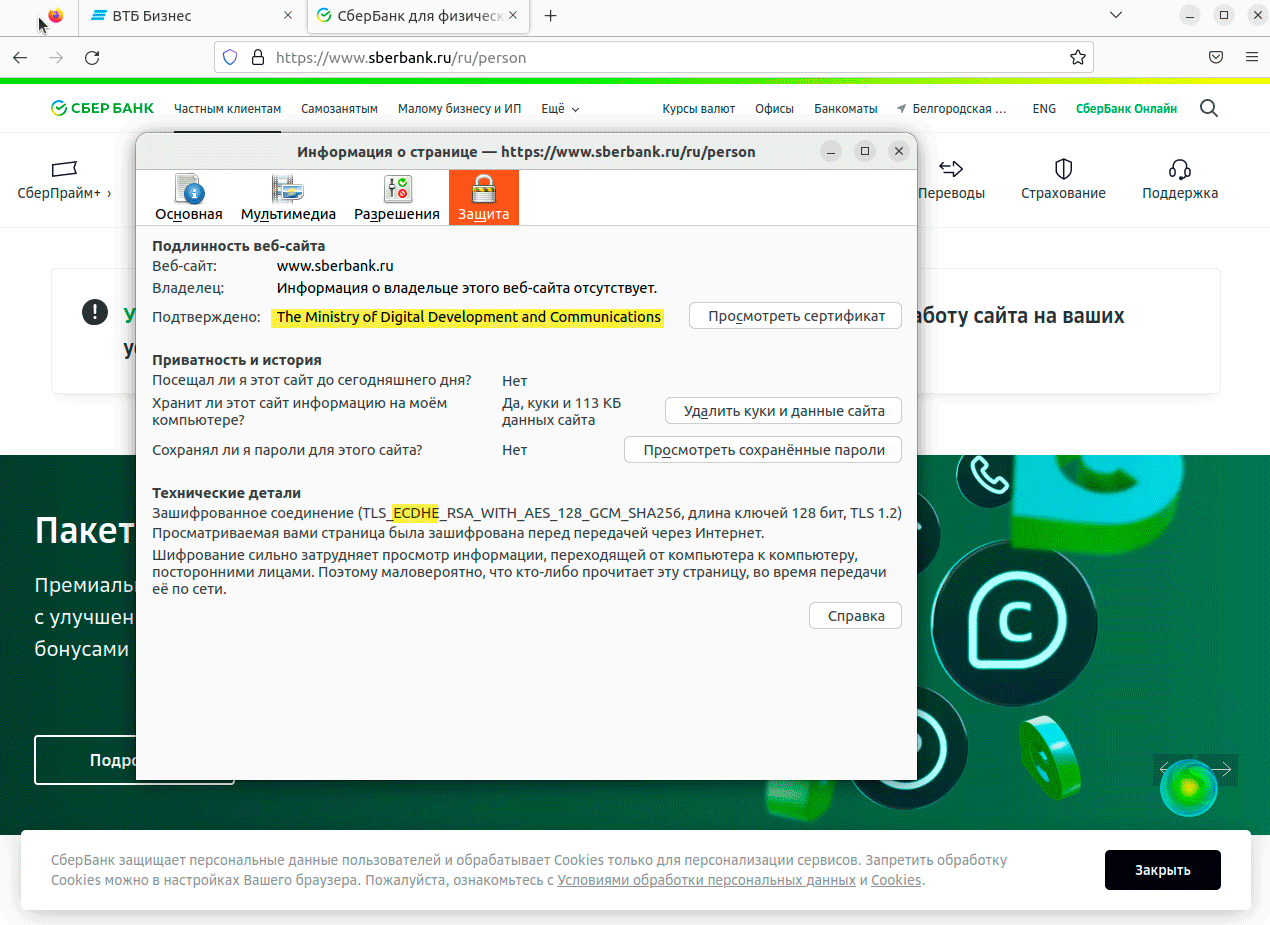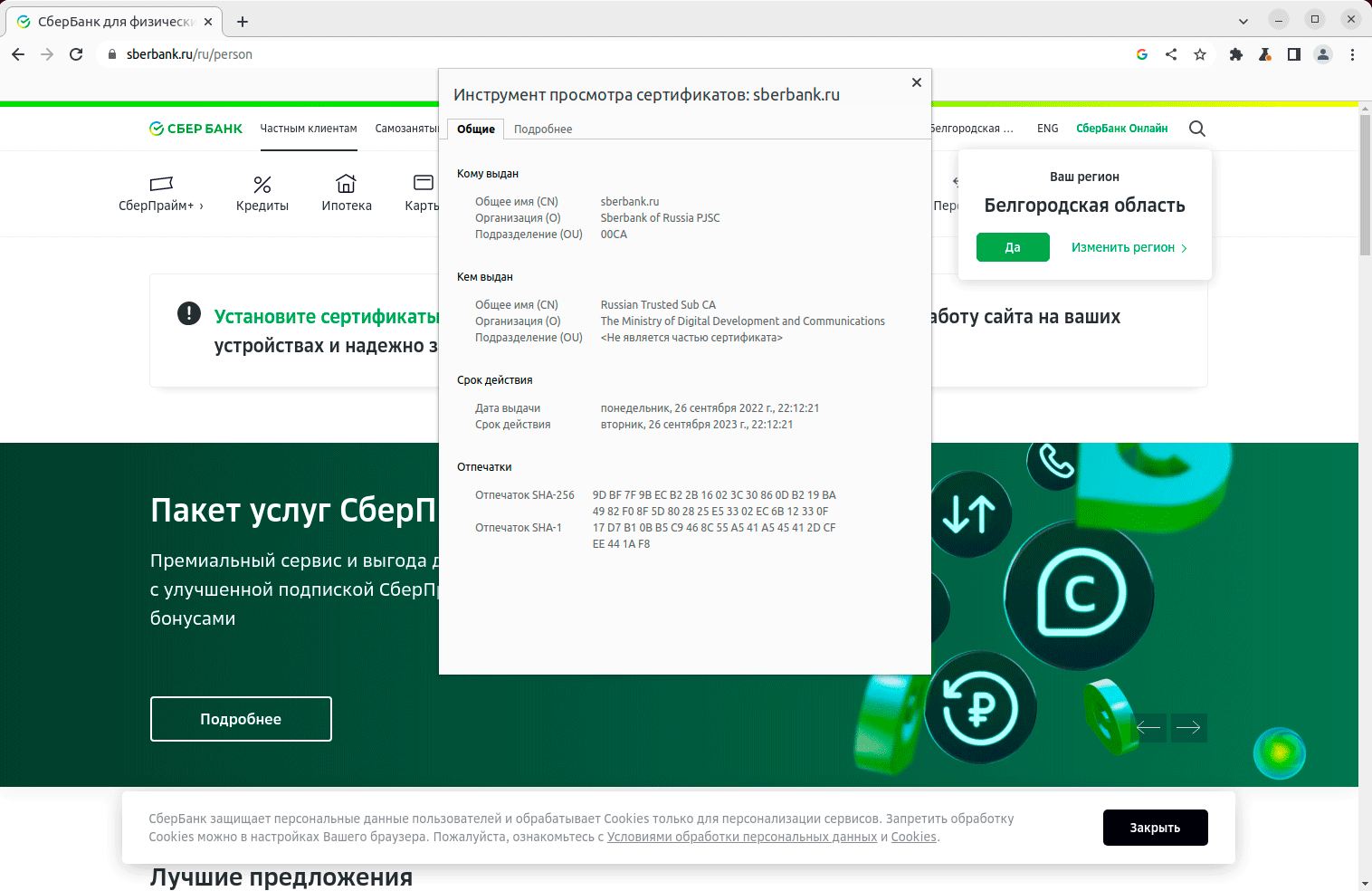 Затем точно также можем посетить сайт Сбербанка и убедиться, что сертификаты установлены успешно.