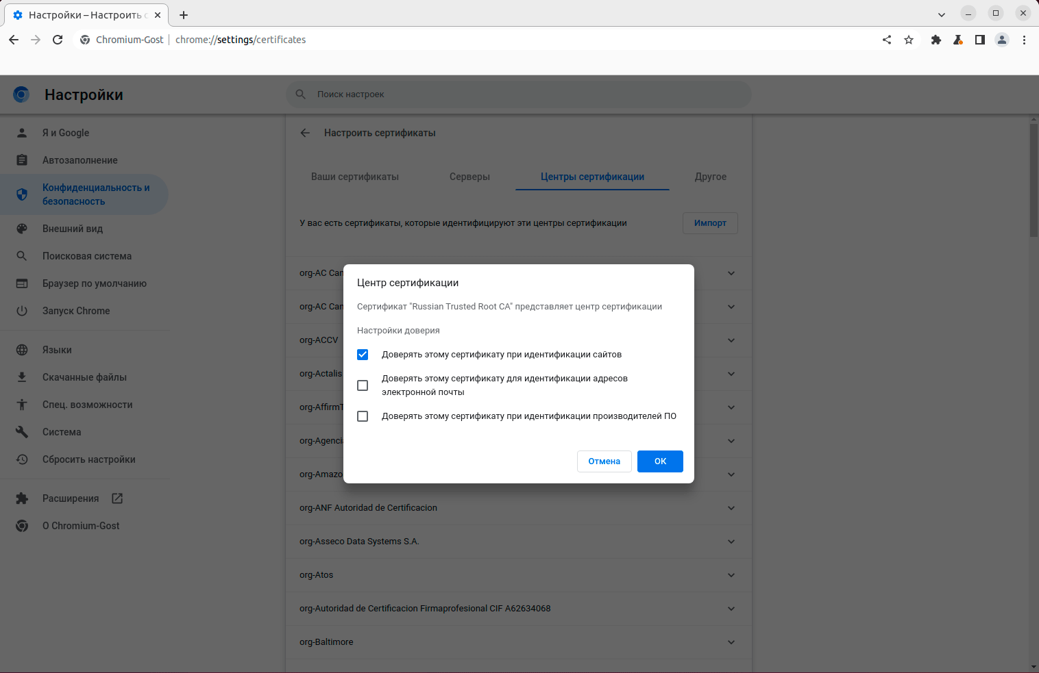 Также, как и Firefoх, Chromium и основанные на нем браузеры не используют системное хранилище и требуют отдельной установки сертификатов. Мы будем рассматривать установку на примере Chromium, в других браузерах путь к настройкам может отличаться. Переходим в Настройки - Конфиденциальность и безопасность - Безопасность - Настроить сертификаты. Затем на закладке Центры сертификации производим импорт сертификатов.