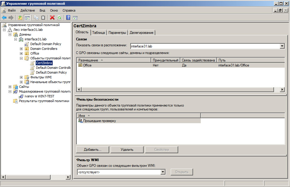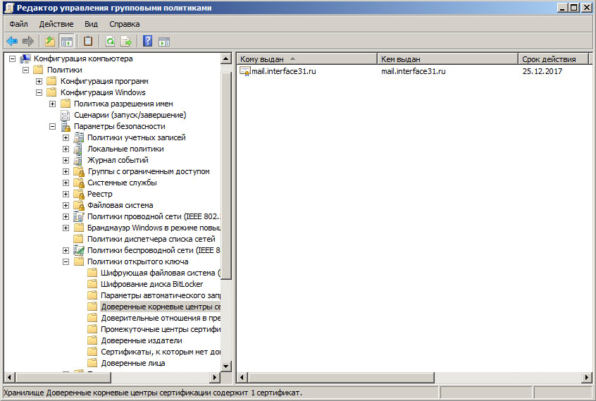 Как видим - все работает и одной головной болью у администратора стало меньше, сертификат будет автоматически распространяться на все компьютеры помещенные в подразделение Office. При необходимости можно задать более сложные условия применения политики, но это уже выходит за рамки данной статьи.