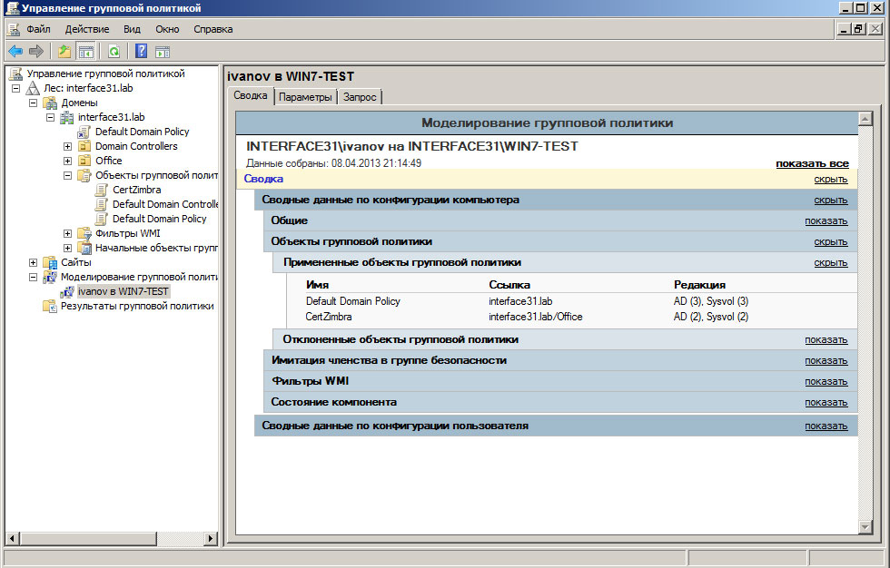 Выполнив моделирование можем убедиться, что политика успешно применяется к указанному компьютеру, в противном случае раскрываем пункт Отклоненные объекты и смотрим причину по которой политика оказалась неприменима к данному пользователю или компьютеру.