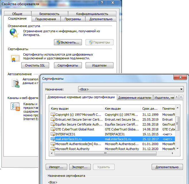 Теперь откроем хранилище сертификатов. Проще всего это сделать через Internet Explorer: Свойства обозревателя -Содержание -Сертификаты. Наш сертификат должен присутствовать в контейнере Доверенные корневые центры сертификации.