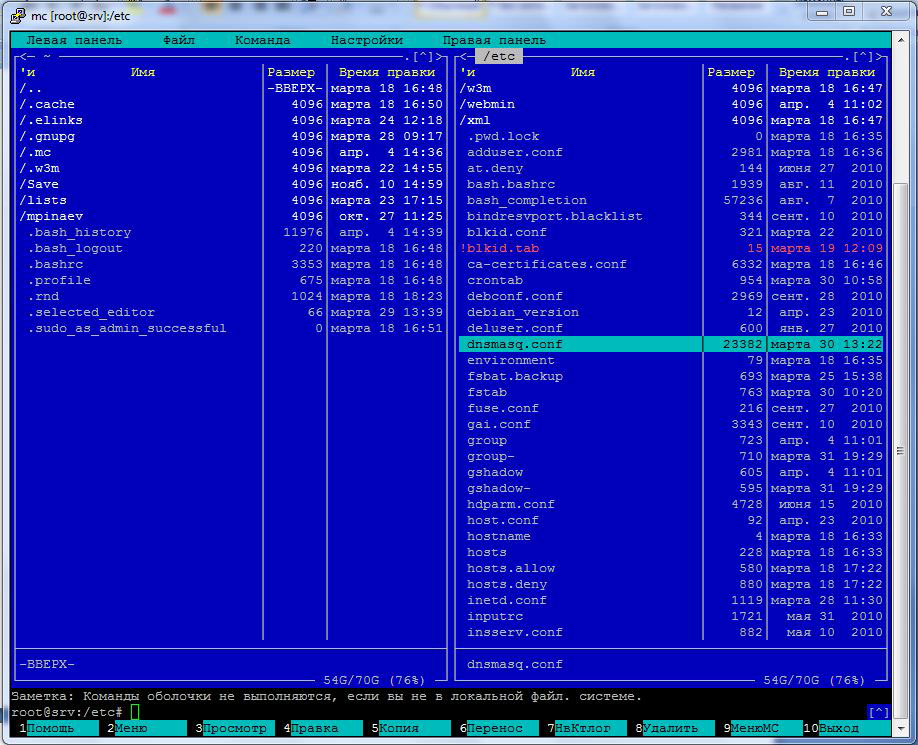 Как я уже упоминал, мой сервер настроен в соответствии с рекомендациями Уварова А.С. и сайта Записки IT специалиста, а значит, DHCP сервер у же установлен и настроен на раздачу IP адресов внутри локальной сети. Все, что необходимо сделать, это дописать несколько строк в конфигурационный файл DHCP сервера. Находится файл в каталоге /etc, и называется этот файл dnsmasq.conf. Открываем его с помощью mc.
