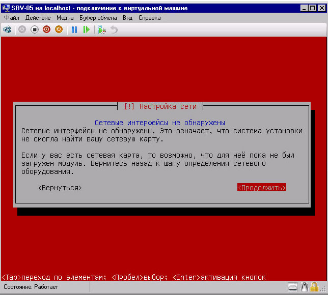Первое серьезное предупреждение в процессе установки сообщит вам, что установщик не смог обнаружить сетевые интерфейсы. Это нормально, по умолчанию Ubuntu не поддерживает виртуальное оборудование Hyper-V, спокойно продолжаем установку.