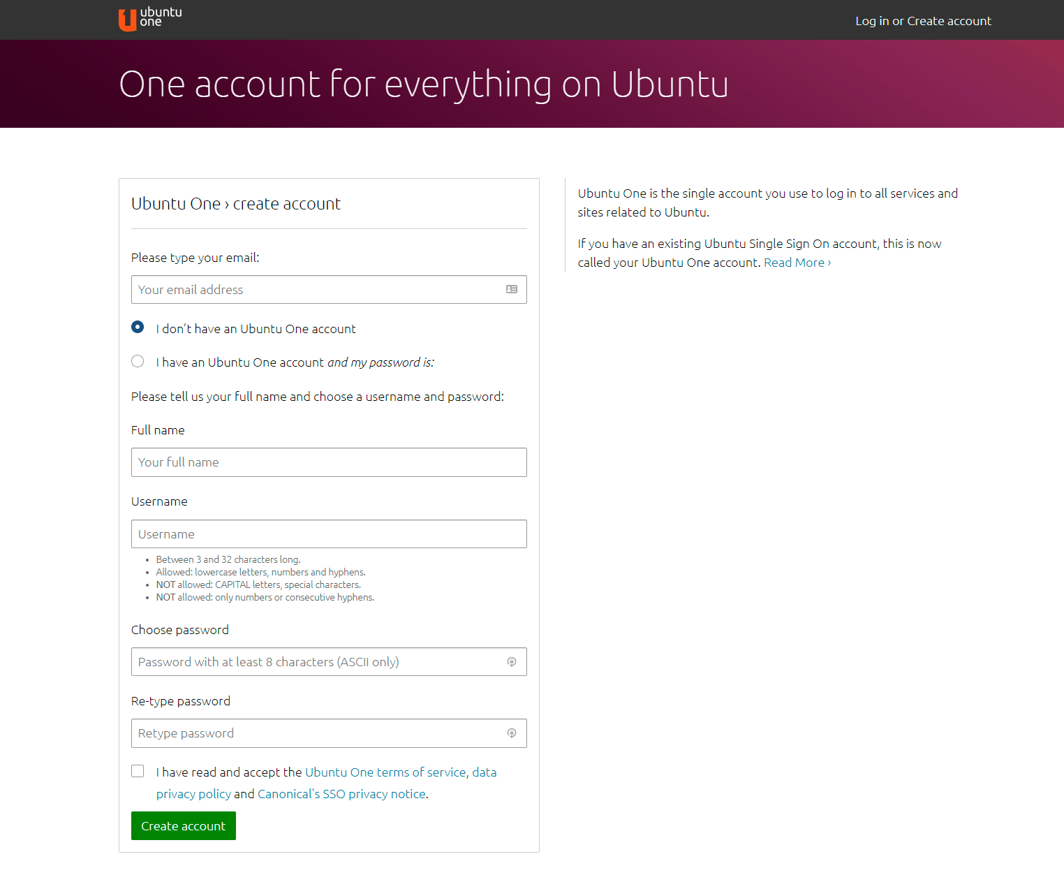 Прежде всего вам нужно зарегистрироваться в сервисе Ubuntu One, никаких особых сложностей там нет, потребуется указать минимум данных и подтвердить адрес электронной почты.