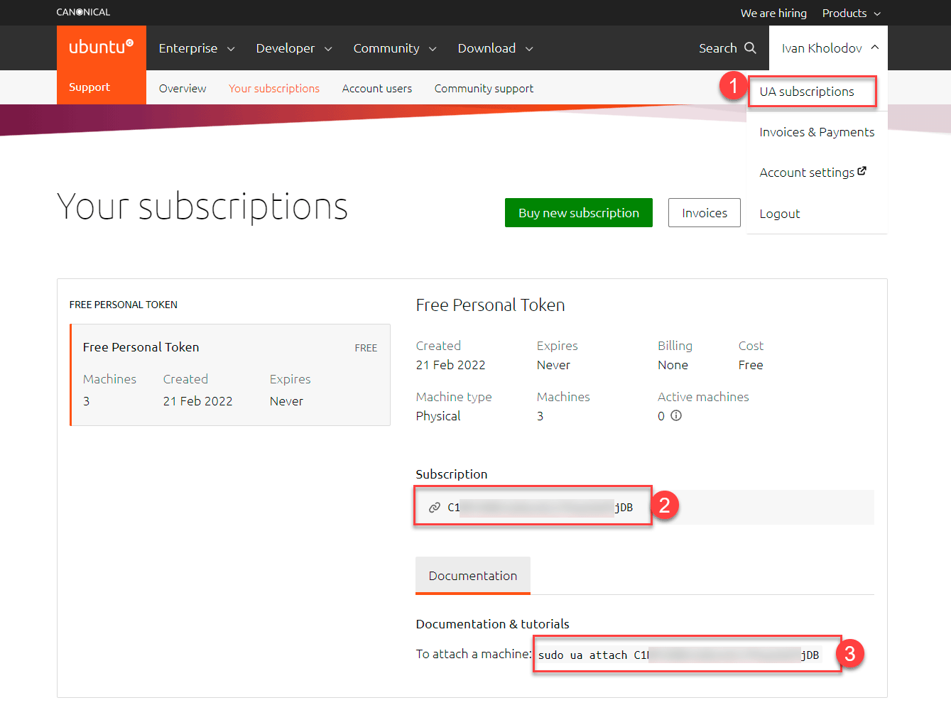 После окончания регистрации и прохождения верификации перейдите на основной сайт Ubuntu и в персональном меню выберите пункт UA subscriptions, на открывшейся странице вы получите токен доступа для бесплатного подключения к Ubuntu Advantage трех физических систем.