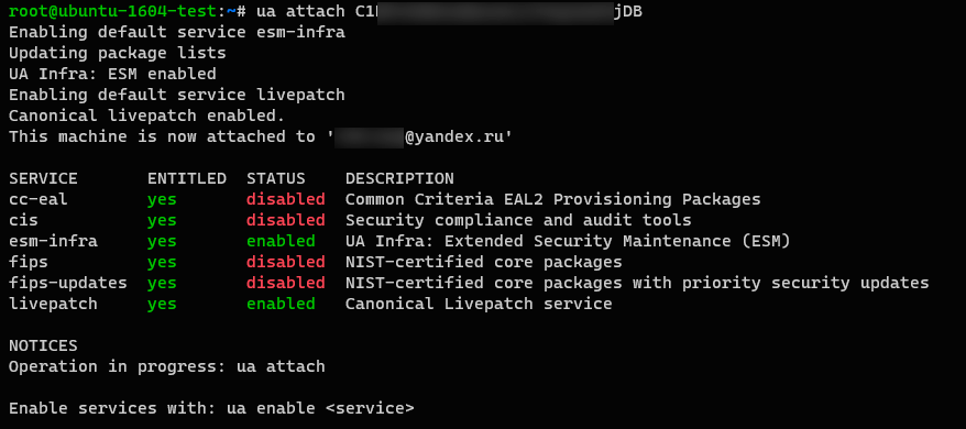 Если теперь мы проверим статус служб Ubuntu Advantage, то увидим, что напротив сервиса livepatch вместо n/a появилось disabled.