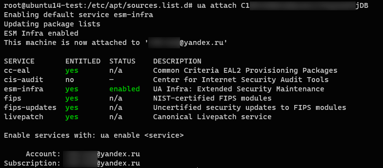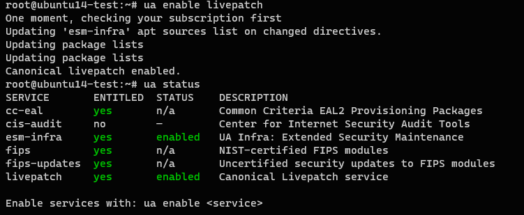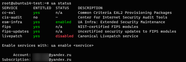 После подключения к Ubuntu Advantage для Ubuntu 14.04 LTS можно заметить, что активировался только сервис esm-infra, а при попытке включить livepatсh мы будем получать ошибку.
