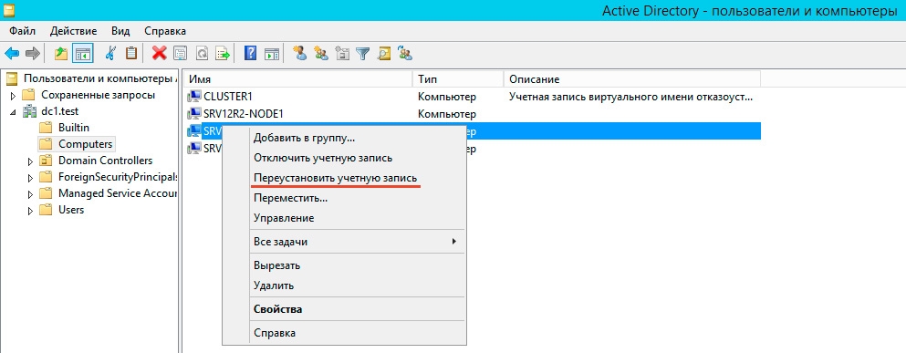 Это самый простой, но не самый быстрый и удобный способ. Открываем на любом контроллере домена оснастку Пользователи и компьютеры Active Directory, находим необходимую учетную запись компьютера и, щелкнув правой кнопкой мыши, выбираем Переустановить учетную запись.