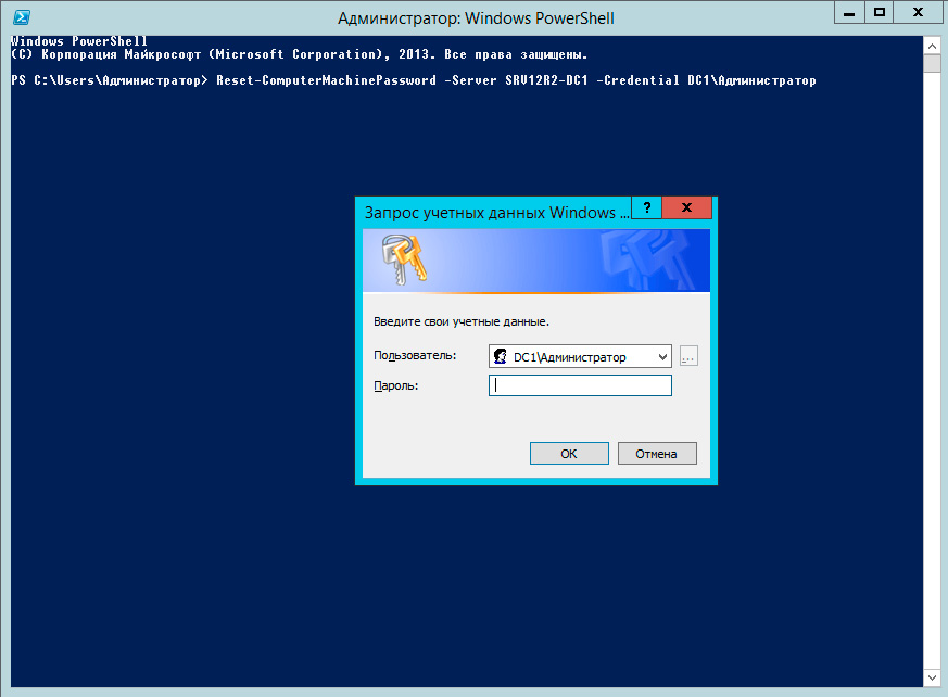 Точно также войдите на системе, для которой нужно восстановить доверительные отношения, локальным администратором, запустите консоль PowerShell и выполните команду: