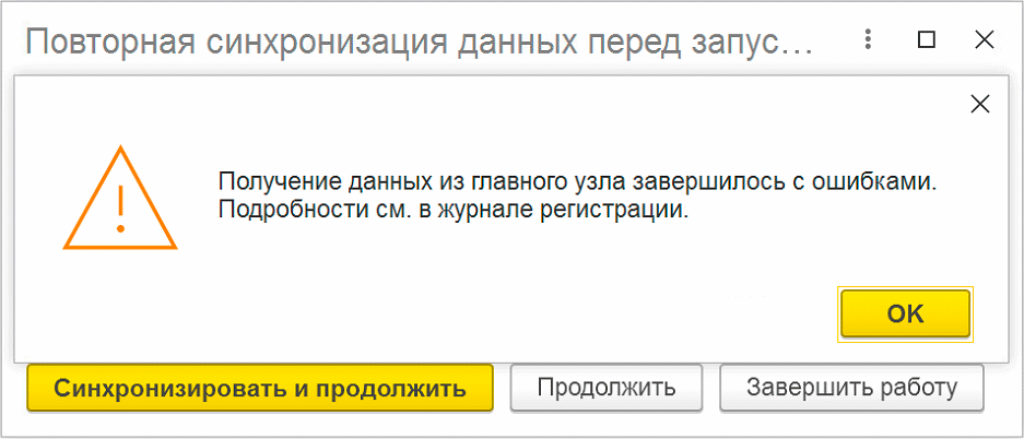 Необходимым требованием для успешной синхронизации является идентичность конфигурации центральной базы и распределенных узлов. Если вы внесли изменения в конфигурацию центрального узла, то эти изменения следует распространить по РИБ, принять и установить, только после этого синхронизация будет продолжена.
