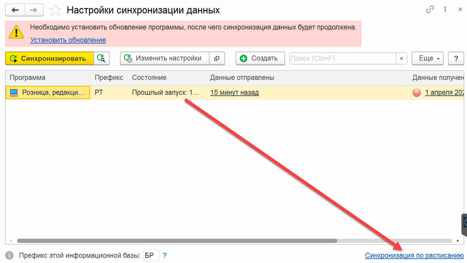 Затем можно вернуться в Настройки синхронизации и Установить обновление, во многих случаев этого окажется достаточно для восстановления нормальной работы автообмена, реже - потребуется повторить процедуру, при этом не забывайте после каждого сеанса синхронизации в РИБ запускать синхронизацию в центральном узле.