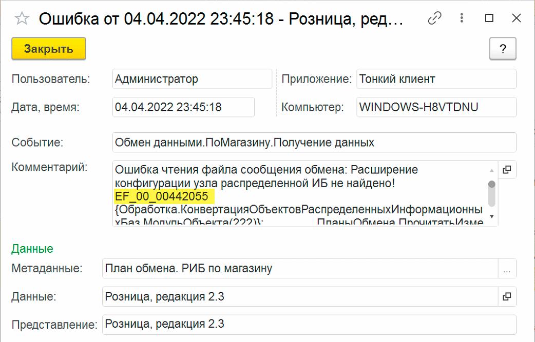 Но бывает все гораздо хуже, после установки обновлений база снова просит повторную синхронизацию и все продолжается по кругу. В этом случае нам ничего не остается, как изучить Журнал регистрации, находим там ближайшую ошибку обмена и внимательно ее изучаем. Как правило там будет явно фигурировать проблемное расширение.