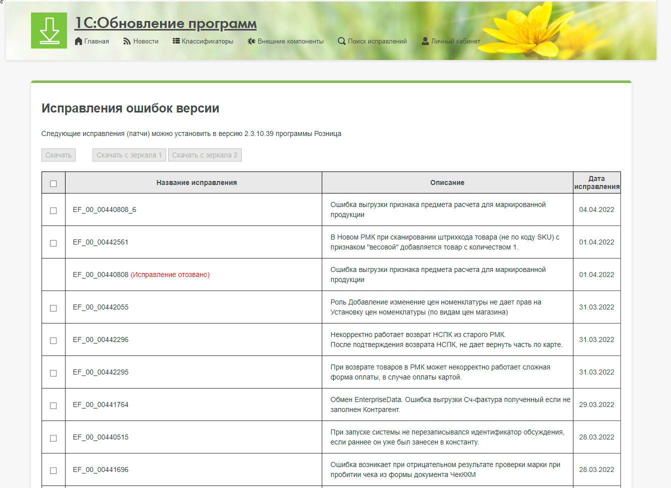 А теперь немного отвлечемся, на портале обновлений 1С можно найти описание всех патчей и внимательно изучить их. А потом крепко подумать и сделать выводы. Большинство исправлений устраняют ошибки, с которыми вы вряд ли бы столкнулись, поэтому необходимость их автоматической установки исчезающе мала. Правильным действием будет ручная установка патчей, по мере выявления проблем.