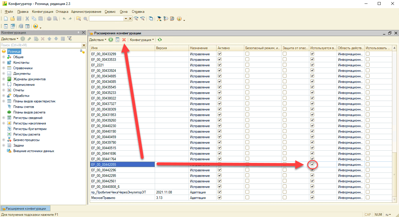 Далее переходим в центральную базу и загружаем ее в режиме Конфигуратора, переходим в Конфигурация - Расширения конфигурации и получаем полный список всех установленных расширений и патчей. После чего находим проблемное расширение и думаем. В некоторых случаях оно может устранять ошибку, которая существенна для центрального узла, но совершенно не влияет на периферию. В таком случае снимаем флаг Используется в РИБ, в остальных случаях просто удаляем расширение и выполняем синхронизацию с нужным узлом.