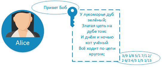 Для того чтобы Ева не могла прочитать сообщение Алиса решает его зашифровать. Существует много способов сделать это, для примера мы возьмем довольно простой, но достаточно эффективный и широко применявшийся в прошлом способ - книжный шифр. Суть его состоит в том, что каждый символ в исходном сообщении заменяется на некую цифровую последовательность, скажем номер строки и номер символа в ней.