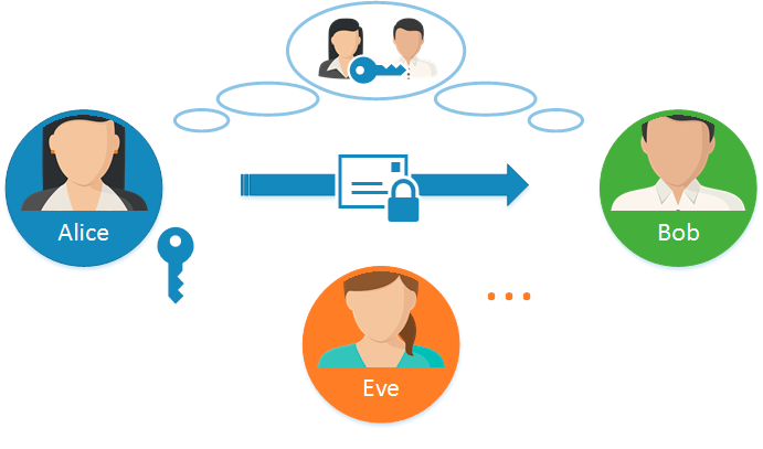 Итак, Алиса хочет отправить сообщение Бобу, но так, чтобы любопытная Ева не могла ознакомиться с его содержимым. Где и как будет передаваться сообщение - Алиса не знает, но знает, что Ева - особа крайне любопытная и при случае обязательно сунет нос в их с Бобом переписку.