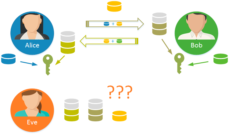 В итоге, получив от другой стороны промежуточный цвет, Алиса и Боб снова добавляют туда одну часть своего секретного цвета, в итоге у каждого из них получится оттенок, который в равных частях содержит оба секретных и общий цвета. Но при этом никакая секретная информация по открытому каналу не передается! Таким образом Алиса и Боб оказываются владельцами общего секрета, который они могут использовать для шифрования переписки не боясь, что ее содержимое станет известно Еве.