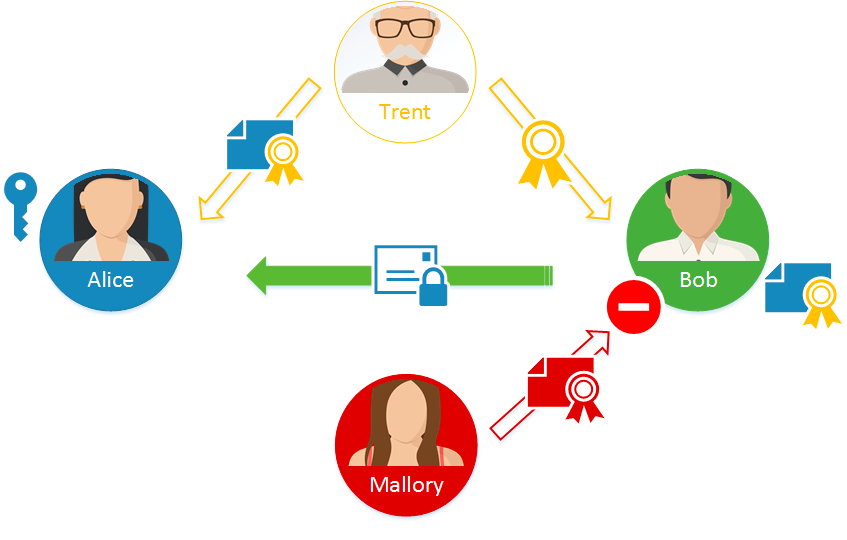 Почему так? Весь вопрос в доверии, если Боб доверяет Алисе, то он доверяет ее УЦ, а установив сертификат УЦ он автоматически будет доверять любому выпущенному Алисой сертификату. Поэтому если Мэллори подменит сертификат "по дороге" или сделает это позже, в незащищенном хранилище, то Боб станет автоматически доверять сертификатам Мэллори, думая, что это сертификаты Алисы.