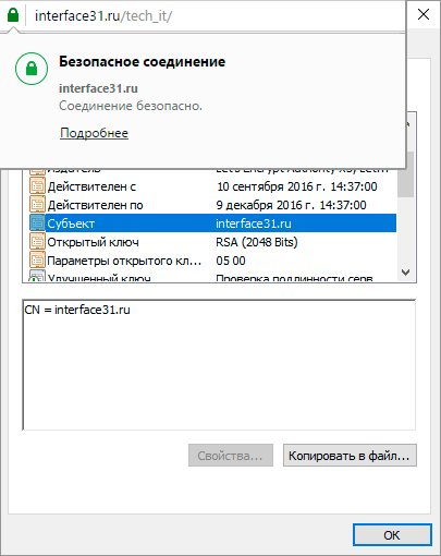 О чем нам говорит этот сертификат? О том, что вы действительно связались с сайтом interface31.ru и передаваемые между вами данные недоступны третьим лицам. Однако он ничего не говорит о том, что владельцы данного сайта существуют или являются теми, за кого себя выдают. Само по себе наличие зеленого замка и защищенного соединения еще никак не обозначает, что данный сайт безопасен или не является мошенническим, единственное в чем вы можете быть уверены - что ваш канал связи защищен.