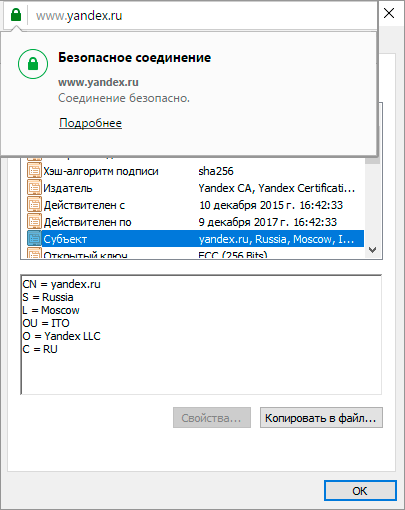 Соединение с сайтом владеющим таким сертификатом визуально отличается крупным указанием компании владельца прямо в адресной строке браузера, а также сообщением, что подлинность компании подтверждена. В поле Субъект также присутствуют дополнительные сведения.