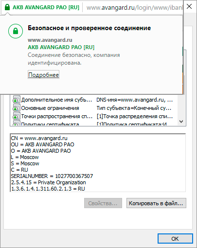 Внешне соединение с таким сайтом ничем не отличается от сайта с DV-сертификатом, но поле Субъект содержит дополнительные сведения о владельце.