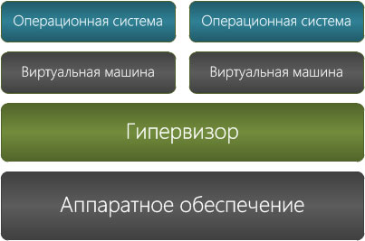 Поверх реального аппаратного обеспечения запущено специальное ПО - гипервизор (или монитор виртуальных машин), который обеспечивает эмуляцию виртуального железа и взаимодействие виртуальных машин с реальным железом. Он также отвечает за коммуникации виртуальных ПК с реальным окружением посредством сети, общих папок, общего буфера обмена и т.п.