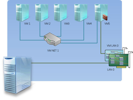 Хост подключен к внешней сети посредством физического сетевого адаптера LAN 0, посредством этого же физического интерфейса к внешней сети подключена виртуальная машина VM5, через сетевой адаптер VM LAN 0. Для остальных машин внешней сети хост и VM5 два разных ПК, каждый из них имеет свой сетевой адрес, свою сетевую карту со своим MAC-адресом. Вторая сетевая карта VM5 подключена к виртуальному коммутатору виртуальной сети VM NET 1, к нему же подключены сетевые адаптеры виртуальных машин VM1-VM4. Таким образом мы в пределах одного физического хоста организовали безопасную внутреннюю сеть, которая имеет доступ к внешней сети только через роутер VM5.