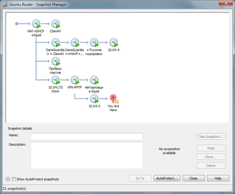 Другое применение моментальные снимки находят в учебных и тестовых целях, с их помощью можно создать целое дерево состояний виртуальной машины, имея возможность быстро переключаться между различными вариантами конфигурации. На рисунке ниже приведено дерево снимков роутера из нашей тестовой лаборатории с которым вы прекрасно знакомы по нашим материалам: