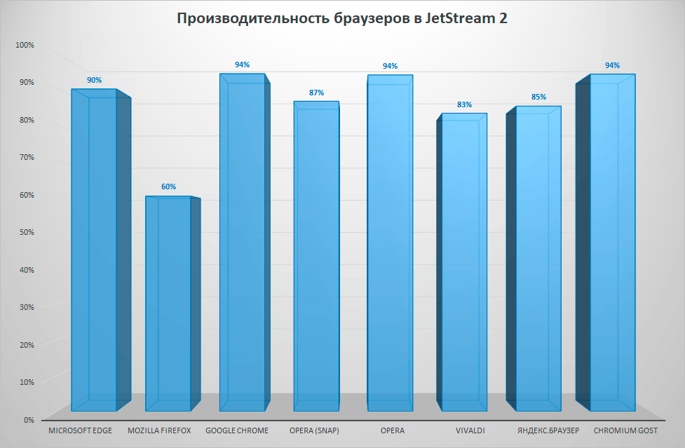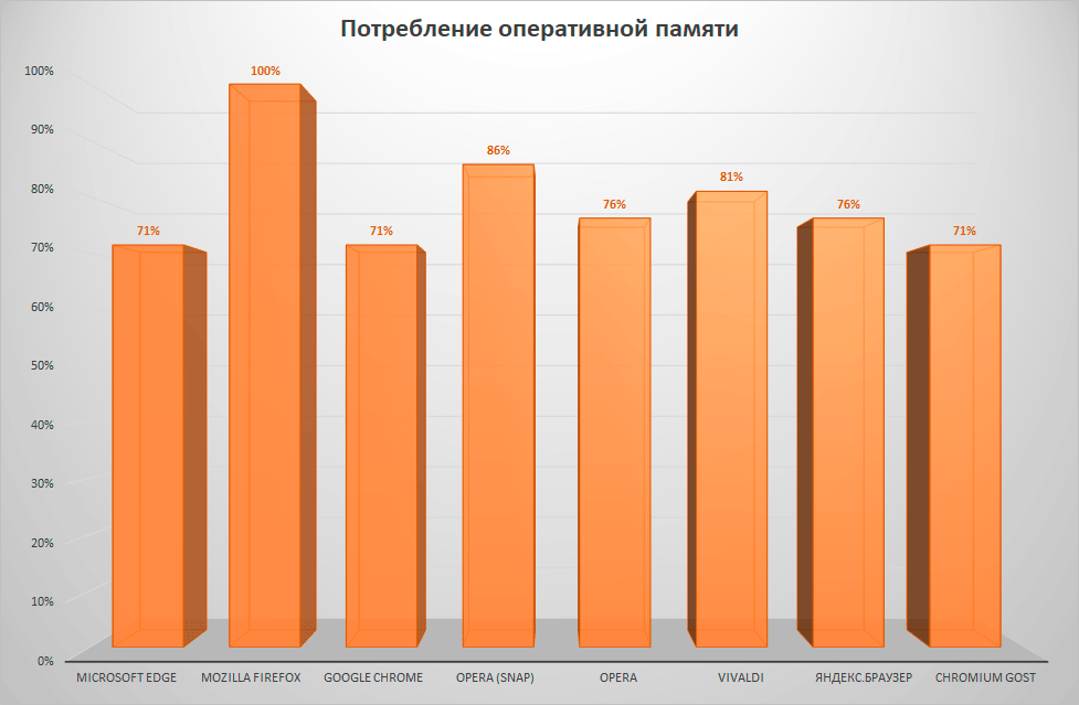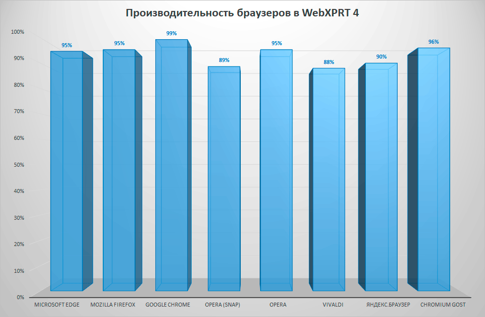 В остальном результаты ничем не выделяются, в лидерах Chrome и браузеры на движке Blink, что касается Snap-версии Opera, то она также уступает, но незначительно, в данном случае на 7%, при этом она показывает производительность на уровне нативных Vivaldi или Яндекс.Браузер.