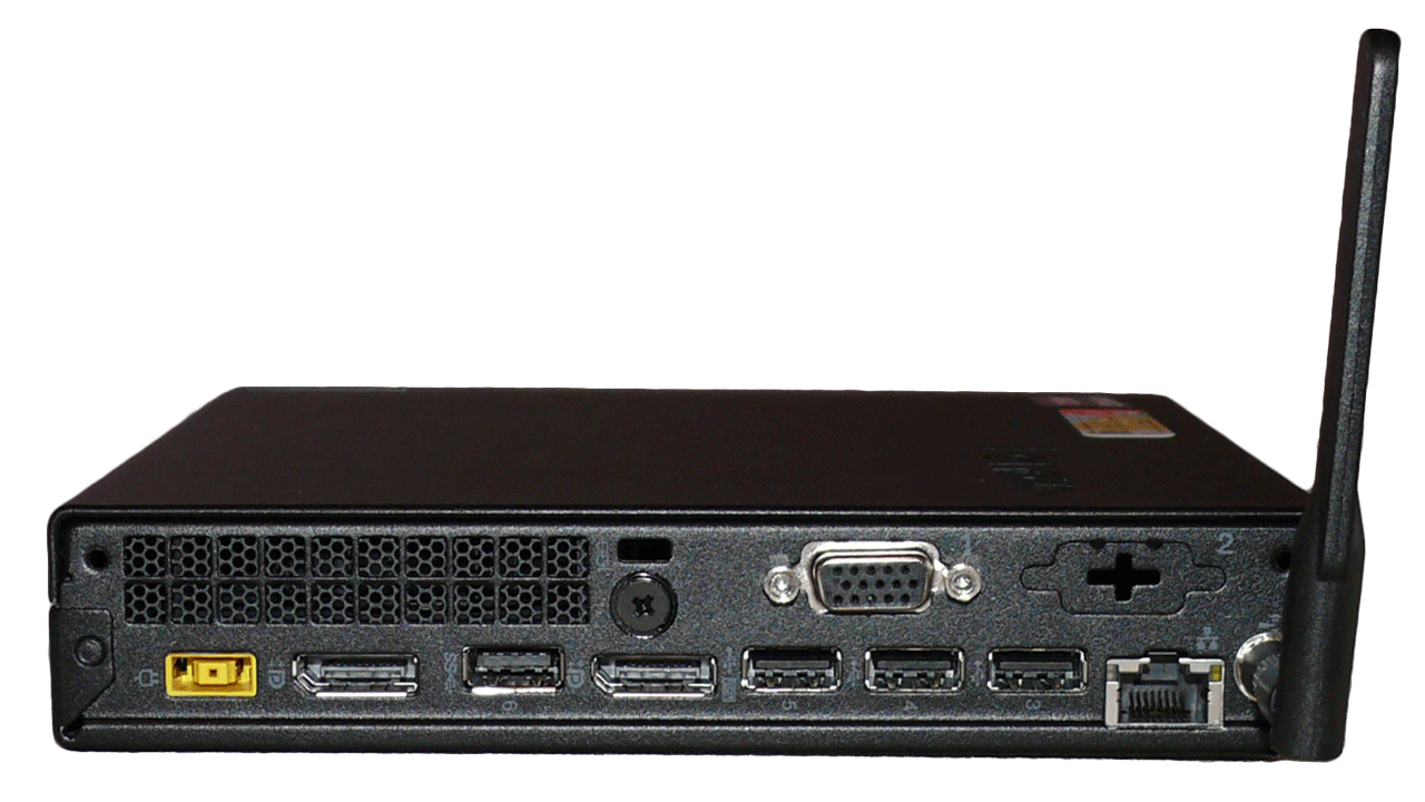 На задней панели расположены 4 разъема USB, 2 Display Port и VGA, также антенна Wi-Fi, Ethernet и фирменный разъем питания Lenovo.