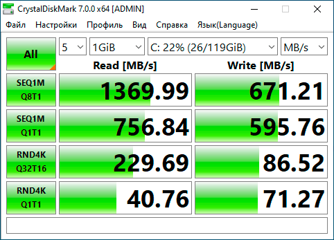 Но прежде всего обратим внимание на дисковую подсистему, потому что она этого заслуживает. Несмотря на бюджетный статус данного компьютера Lenovo установили в него хороший PCI-e x2 SSD, который показал следующие характеристики: