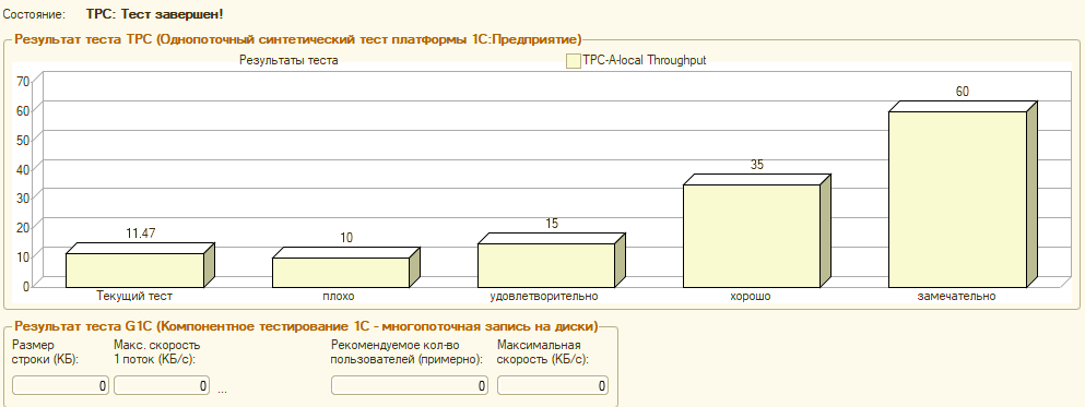 Теперь перейдем к специфике - тесту Гилева, который позволяет оценить производительность 1С:Предприятия. Здесь мы получили неожиданно низкий результат, мы несколько раз повторили тест с разными настройками режима энергосбережения, но принципиальной разницы это не дало.
