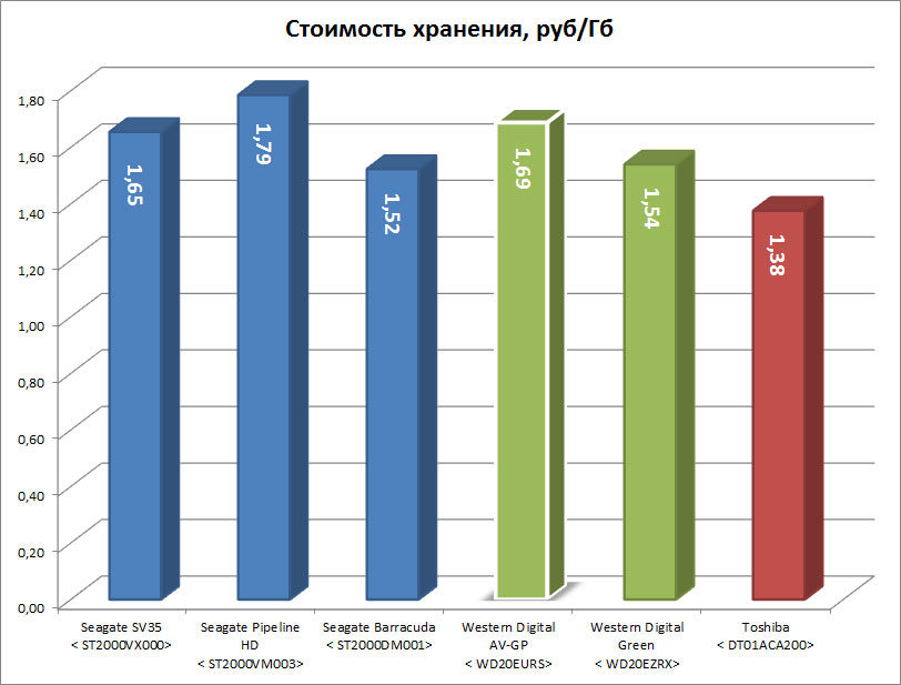 По стоимости хранения диск ничем не выделяется среди своих одноклассников и имеет примерно равное значение с Seagate SV35, хотя и выше чем у дисков массового применения.