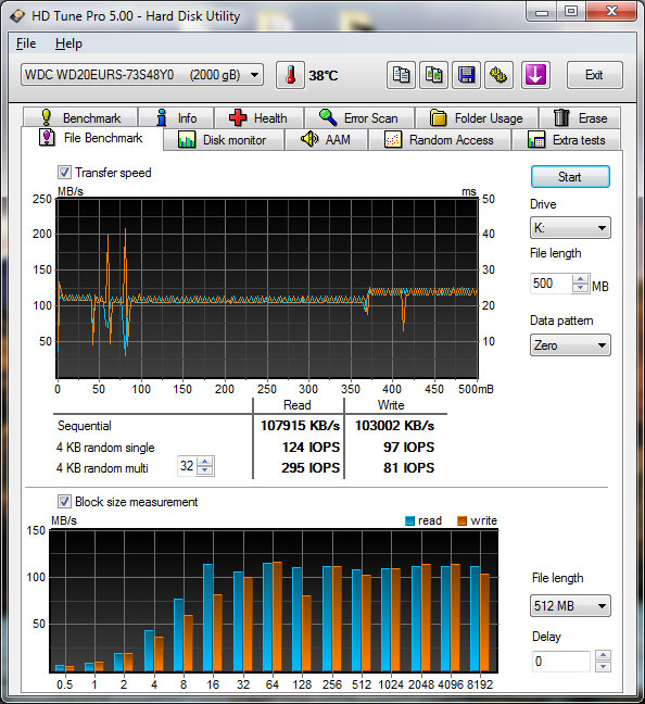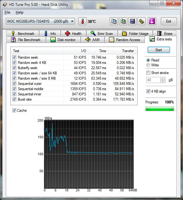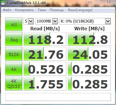Результаты CrystalDiskMark показали очень и очень невысокие результаты, особенно там, где касается случайного чтения. Хотя скорость линейного доступа вполне достаточна для работы с потоковым видео, в тоже время современные диски массовых серий имеют более высокие показатели линейной скорости.