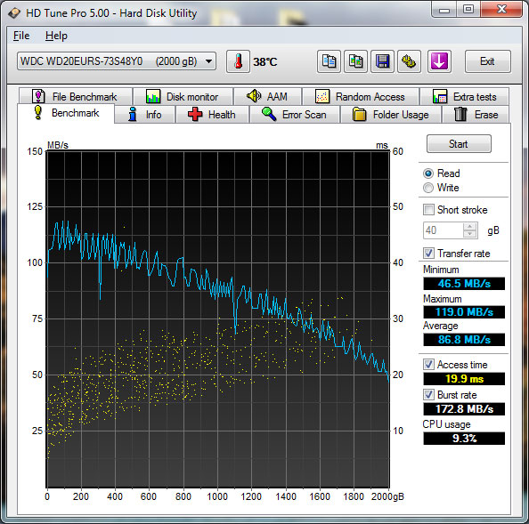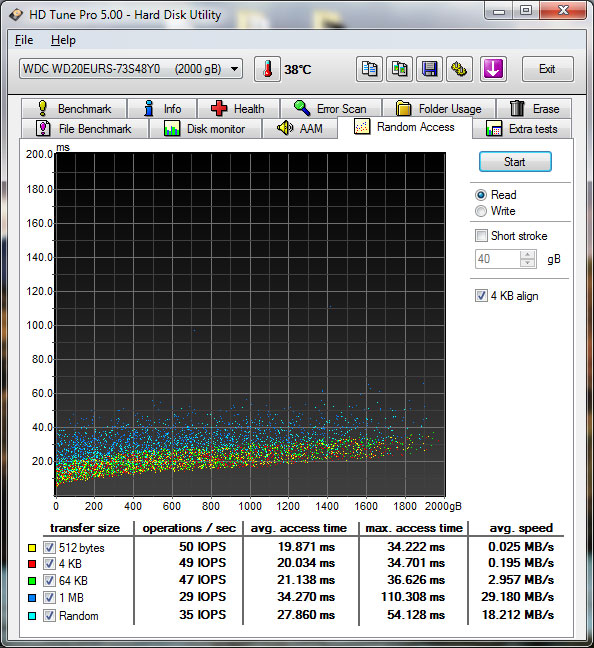 Результаты теста случайного доступа также невысоки, данный диск здесь уступил даже зеленому собрату, показав значения на уровне 2,5" ноутбучного диска. Однако записать это в недостатки данного диска нельзя, характер применения данного семейства дисков не предполагает подобной нагрузки.