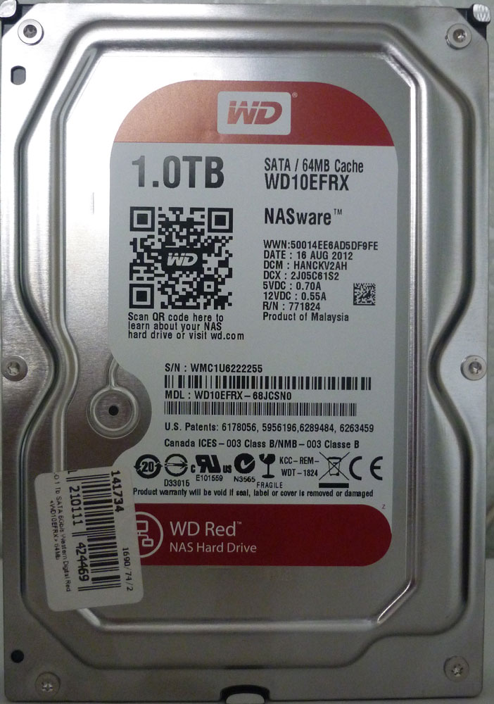На тестирование в нашу лабораторию попали четыре HDD 1 Tb SATA 6Gb / s Western Digital Red (WD10EFRX) 64Mb, стоимость которых на конец октября 2012 года составила 2766 руб. По характеристикам данные диски ближе всего к зеленой серии - низкое энергопотребление и уровень шума, переменная скорость вращения шпинделя. Отличает их наличие специализированных технологий для работы в RAID-массивах и системах NAS и более высокий MTBF - 1 млн. часов против 650 тыс. у "зеленой" серии, но ниже чем у RE - 1,2 млн.