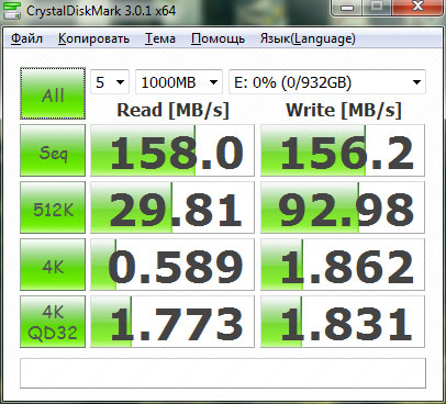 CrystalDiskMark показал вполне неплохие для современного диска скоростные параметры, разве что несколько насторожила довольно низкая скорость чтения с размером блока 512 Кб.