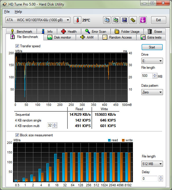 Здесь результат даже хуже чем у диска "зеленой" серии и явно дает о себе знать назначение диска - для бюджетных систем хранения и недорогих NAS, когда на первый план выходит емкость и потребление энергии, а также шум и нагрев, а не скоростные характеристики. Надо сказать что с этим у "красных" дисков все в порядке: мы не зафиксировали сколь нибудь заметного нагрева, а в этом тесте, одном из самых шумных, мы практически не слышали диска, так что о тишине можно не беспокоиться.