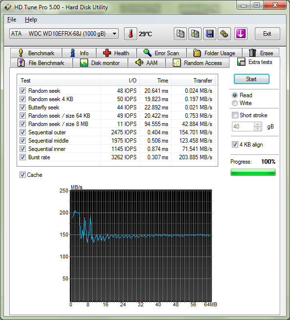 График демонстрирует резкие провалы в скорости практически до нуля. По факту диск не в состоянии обеспечить даже итоговые 47 МБ/с на протяжении всего теста, т.е. два фильма одновременно посмотреть с такого диска скорее всего не удастся. К сожалению наш коллега, тестировавший "зеленый" WD не проводил подобных тестов и поэтому мы не можем сказать характерно такое поведение только для "красной" серии или это особенность всех экономичных дисков данного производителя. Также трудно сказать что может быть причиной: переменная скорость вращения шпинделя или высокое время произвольного доступа, а может быть все факторы вместе взятые.