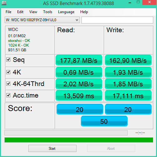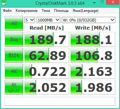 Посмотрим на общие характеристики диска, CrystalDiskMark: