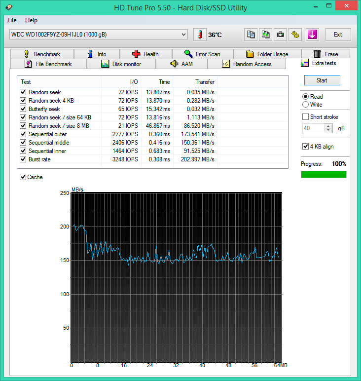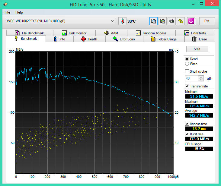 Перейдем к тестам HD Tune Pro. График чтения достаточно равномерен и выдает средние 142,7 МБ/с при 13,7 мс времени случайного доступа. Это значительно лучше, чем у одноклассников и лучше, чем у Constellation ES.