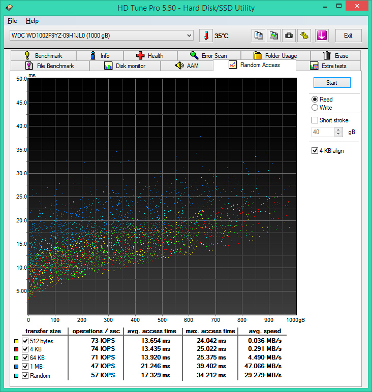 Перейдем к одному из самых интересных тестов - времени случайного доступа. Уступая Constellation ES, новый диск от WD уверенно обходит Seagate NAS и не оставляет никаких шансов WD Red.
