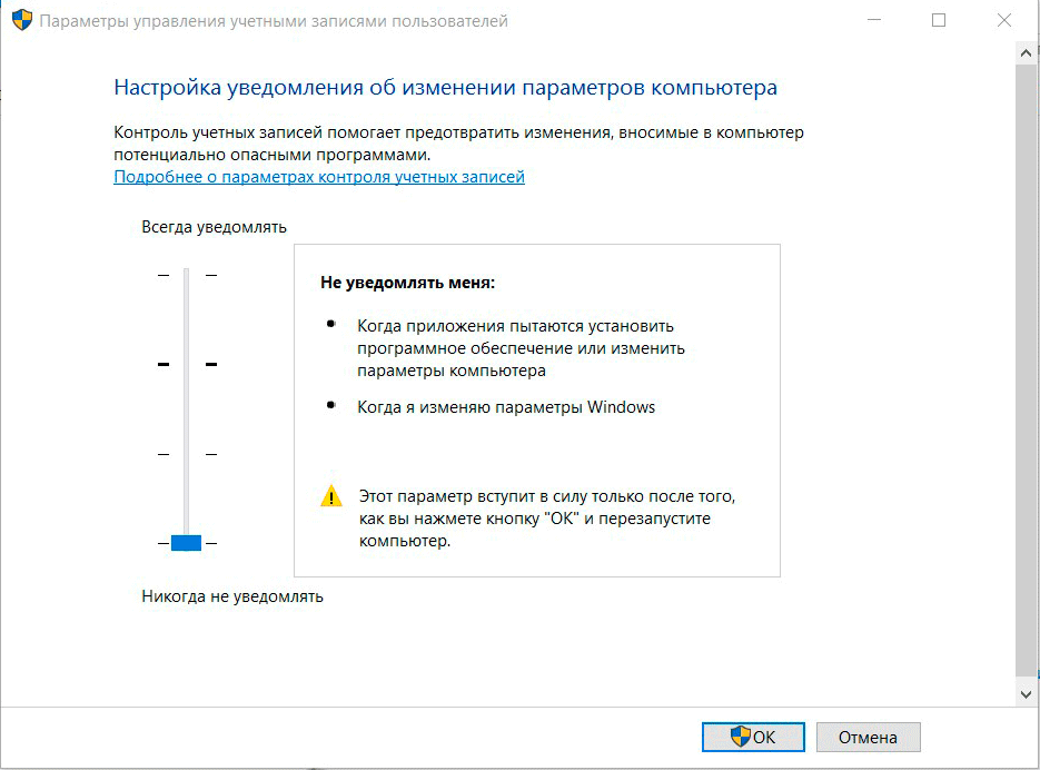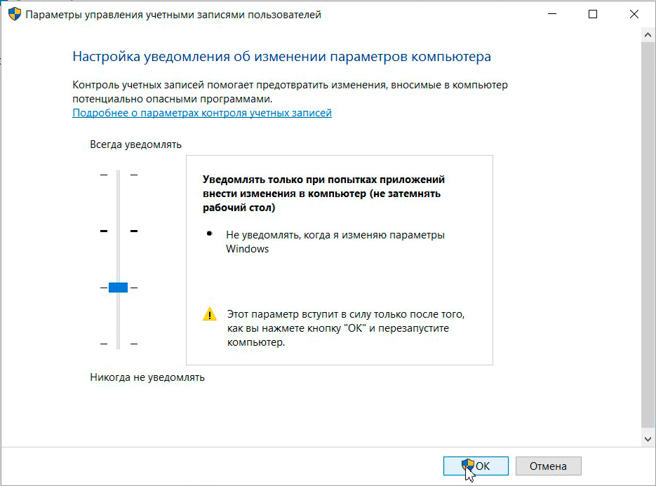 В общем проблема понятна, как и понятны пути ее решения. Поднимаем ползунок UAC вверх и перезагружаем компьютер.