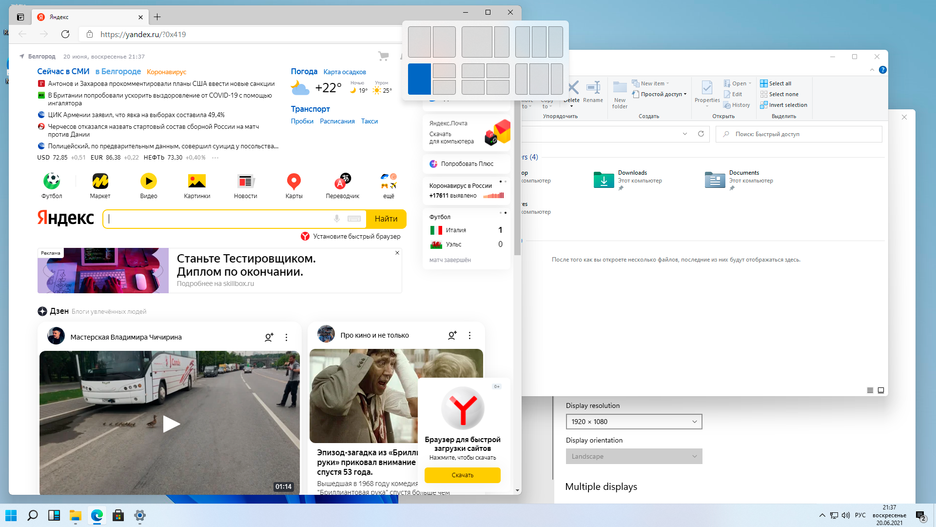 А вот что нам понравилось, так это новый способ привязки окон на экране, теперь вариантов их размещения гораздо больше, чем просто привязать окно к половине или четверти экрана, чтобы увидеть доступные шаблоны нужно щелкнуть правой кнопкой мыши по значку развёртывания окна, а затем выбрать в какой зоне мы хотим видеть текущее окно.