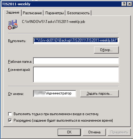 "TIS2011-weekly.job" (ntbackup.exe) 07.06.2011 23:46:44 ОШИБКА" Попытка получения учетных данных для указанного задания окончилась неудачей, поэтому задание выполнено не было. Либо произошла ошибка, либо для этого задания отсутствуют учетные данные.