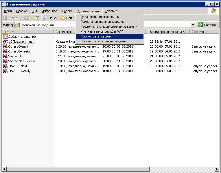 В любом случае при возникновении каких либо проблем в первую очередь следует обращаться к журналу планировщика, для этого в окне Назначенные задания выберите меню Дополнительно в котором нас интересует пункт Просмотреть журнал.